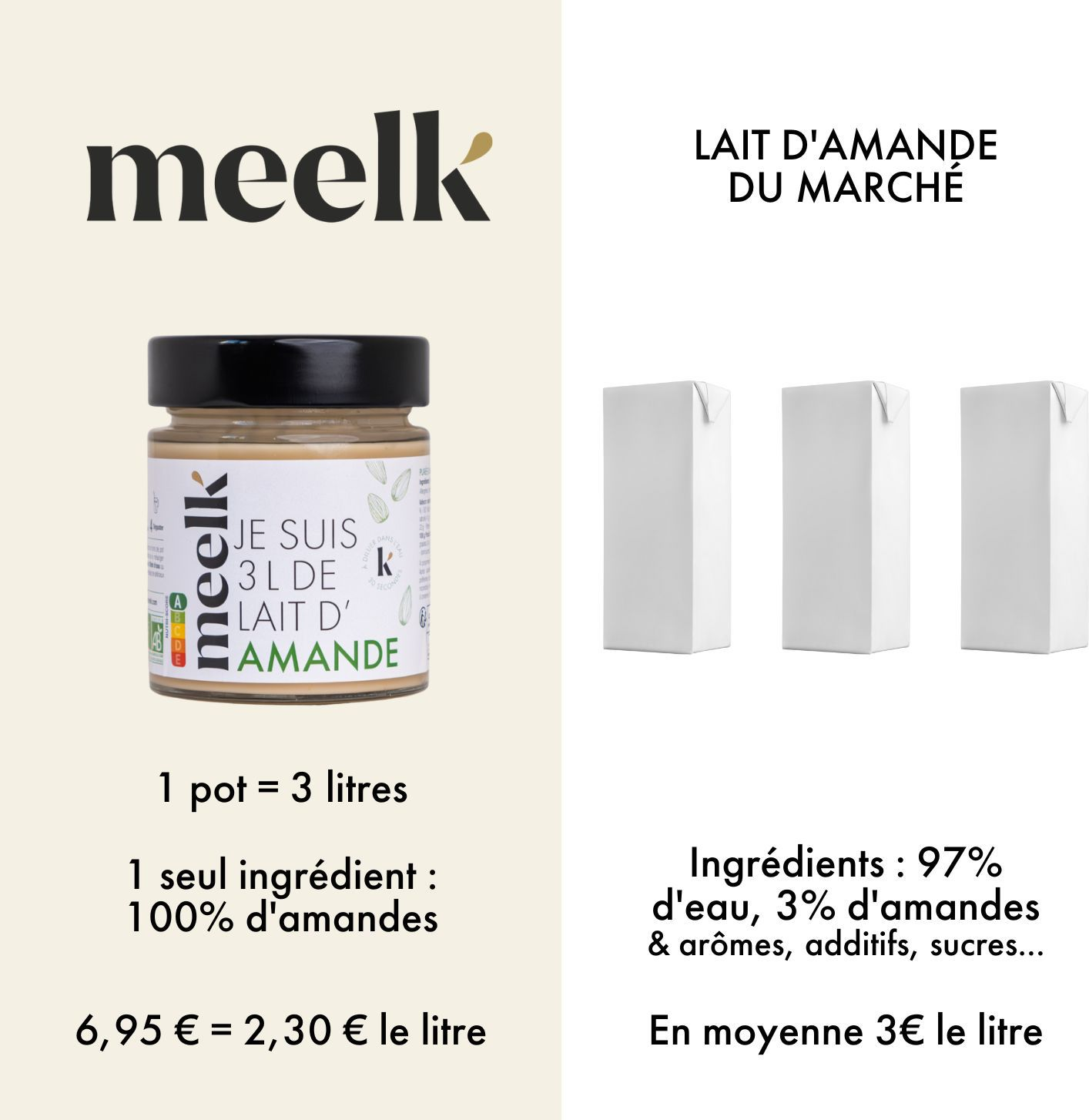 Une brique de lait végétal classique est composée à plus de 90% d’eau. Pour éviter l’impact CO² du transport, découvrez Meelk, une boisson végétale 3en1 avec des amandes ou des noisettes, et rien d'autre!